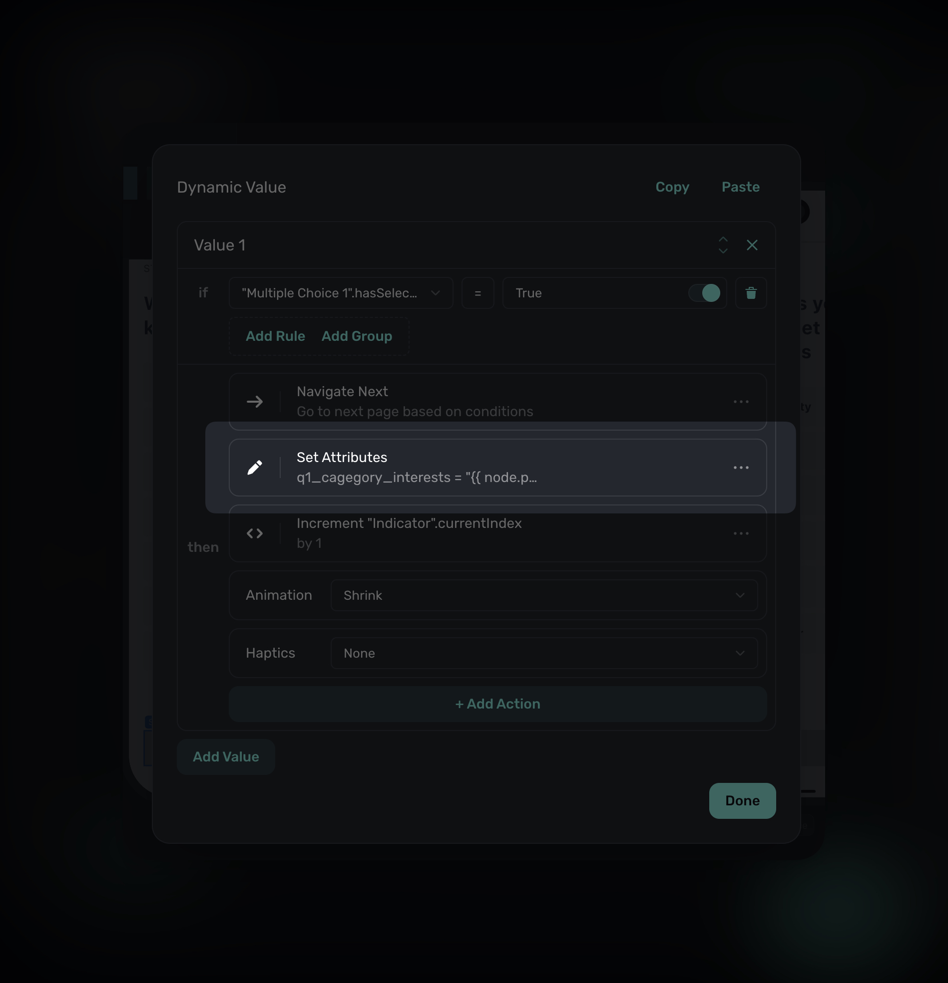 For example, a "Next" button can do more than navigate to the next page. It could, for example, also read from a multiple choice selection, and set its selection to a custom user attribute. By using the tap behavior of "Set Attribute", the value will be set to the user: