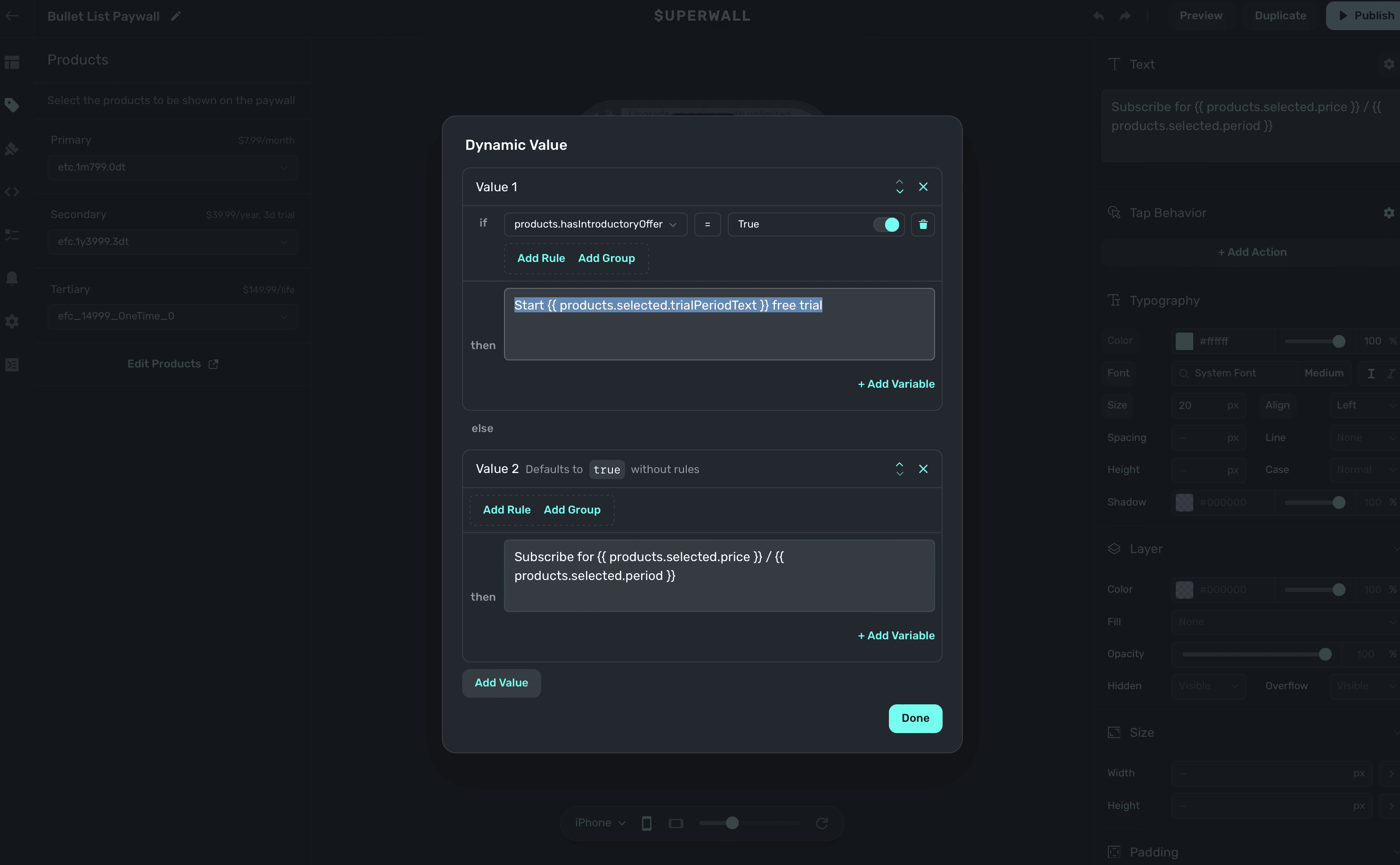 2. Then set the text of the component to "Start {{ products.selected.trialPeriodText }} free trial" (i.e. what to do when a condition is met)