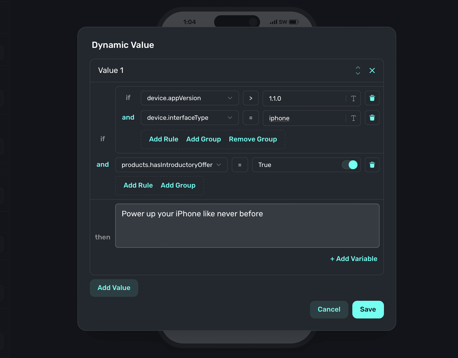 Here, some text is set if the user's app version is greater than 1.1.0 and they are on an iPhone. If those are true, and they have an introductory offer — the text "Power up your iPhone like never before" is used.