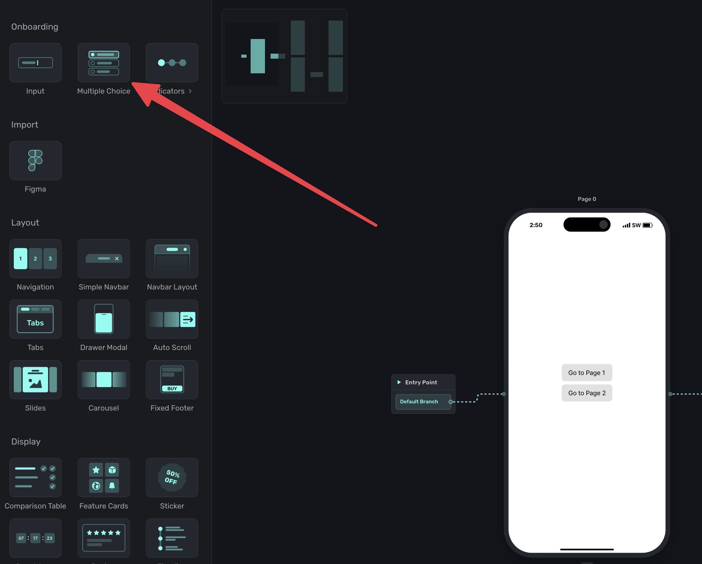 The multiple choice element presents a set of options for users to select from. It is commonly used in onboarding flows to gather preferences, capture survey responses, or enable branching based on user input.