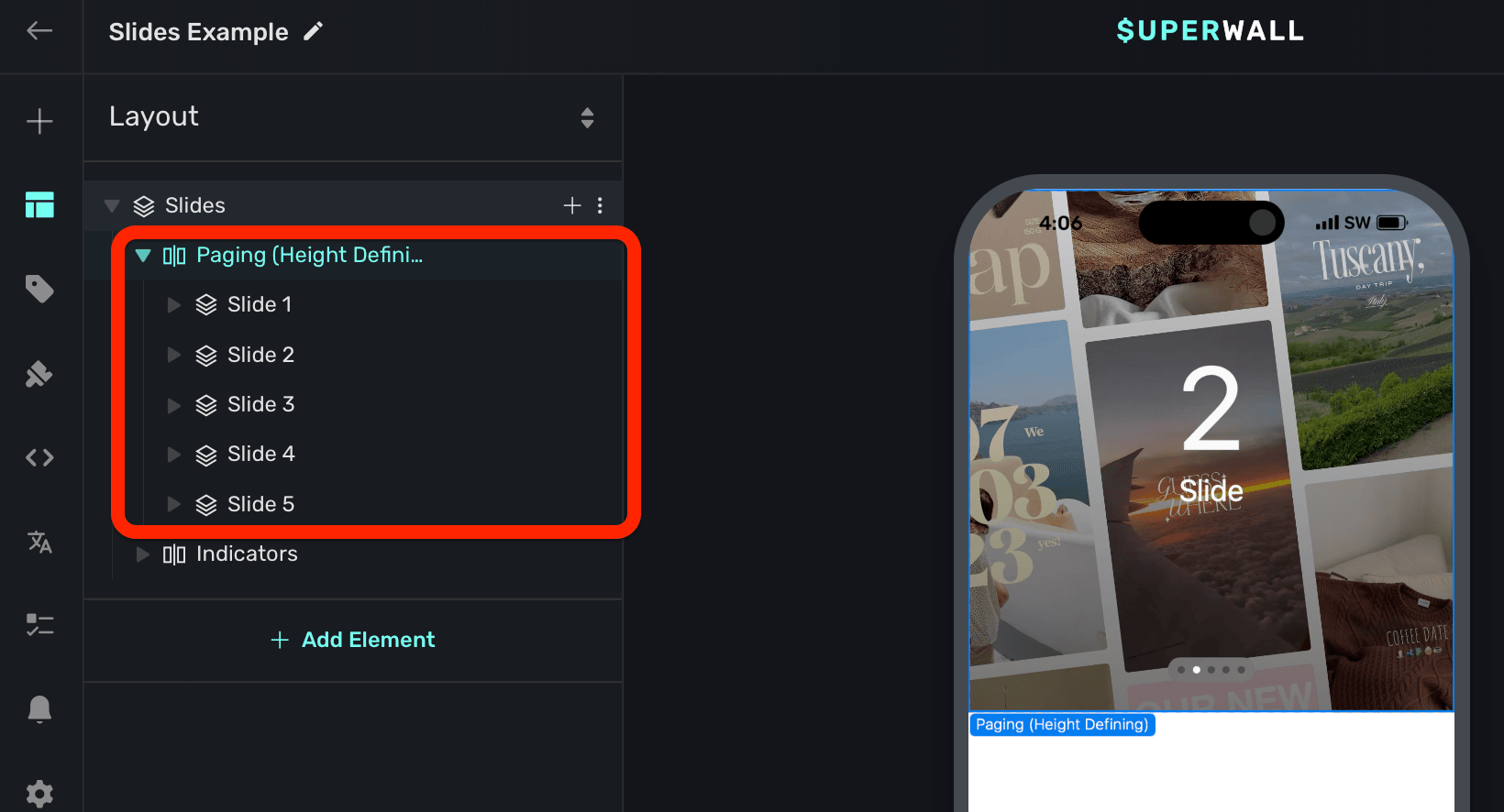 When a slides element is added, Superwall automatically creates an element variable for it (accessed through the Variables tab in the left sidebar, or the variables button in the floating toolbar). Its name will match whatever is in the element hierarchy in the left sidebar: