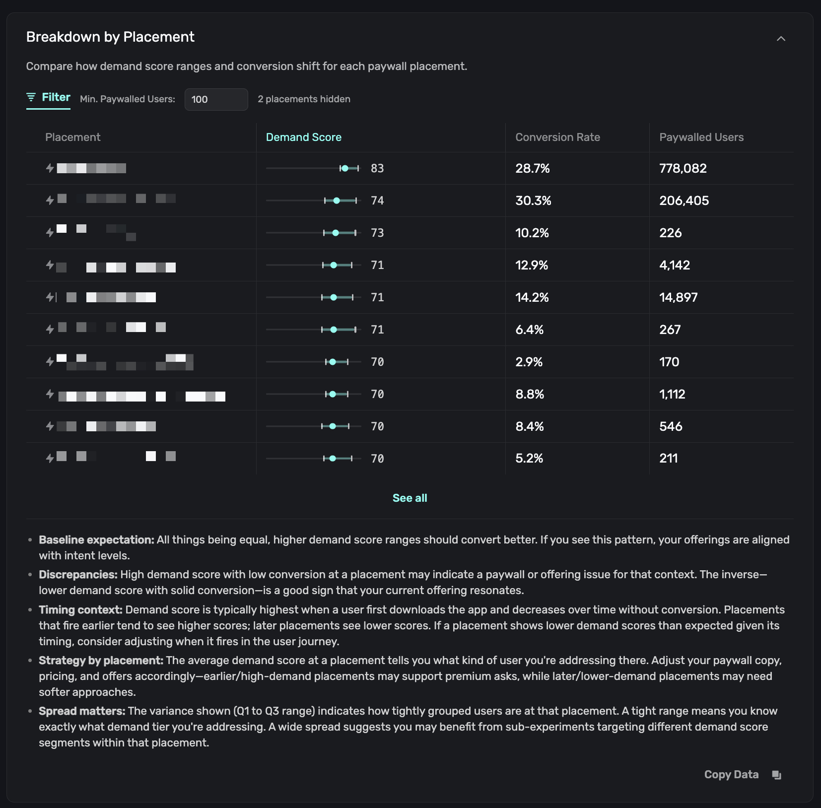 Use the Min. Paywalled Users filter to hide low-volume placements and focus on statistically meaningful data.