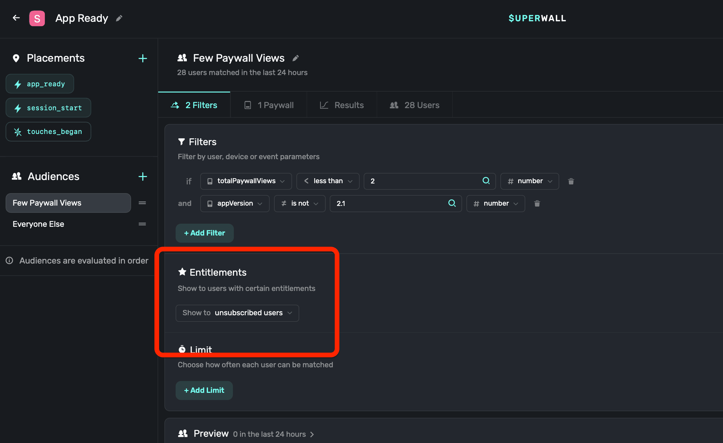 Remember that the Superwall SDK uses its audience filters for a similar purpose. You generally don't need to wrap your calls registering placements around if statements checking if a user is on a paid plan, like this: